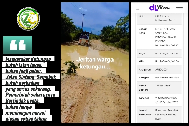 Berdasarkan data LPSE Provinsi Kalimantan Barat, paket pekerjaan untuk ruas jalan tersebut sempat tayang melalui Dinas Pekerjaan Umum dan Penataan Ruang Provinsi Kalimantan Barat dengan Pagu Anggaran Rp4.999.847.000 dan HPS Rp5 miliar bersumber dari APBD Provinsi 2025. Namun Publik dibuat ternganga: statusnya berubah menjadi Tender Gagal. Proyek batal, jalan tetap hancur, Rakyat kembali jadi korban.