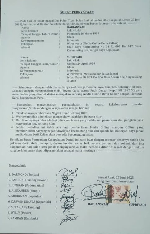 Sebuah surat pernyataan bertanggal 27 Juni 2025 yang memuat larangan terhadap Jurnalis untuk memasuki wilayah Kecamatan Belitang Hilir, Kabupaten Sekadau, Kalimantan Barat, menuai kecaman keras dari berbagai kalangan, khususnya komunitas pers dan organisasi pembela kebebasan pers di Indonesia.