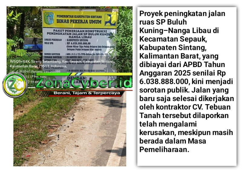 Proyek peningkatan jalan ruas SP Buluh Kuning–Nanga Libau di Kecamatan Sepauk, Kabupaten Sintang, Kalimantan Barat, yang dibiayai dari APBD Tahun Anggaran 2025 senilai Rp 6.038.888.000, kini menjadi sorotan publik. Jalan yang baru saja selesai dikerjakan oleh kontraktor CV. TEBUAN TANAH tersebut dilaporkan telah mengalami kerusakan yang serius, meskipun masih berada dalam Masa Pemeliharaan.